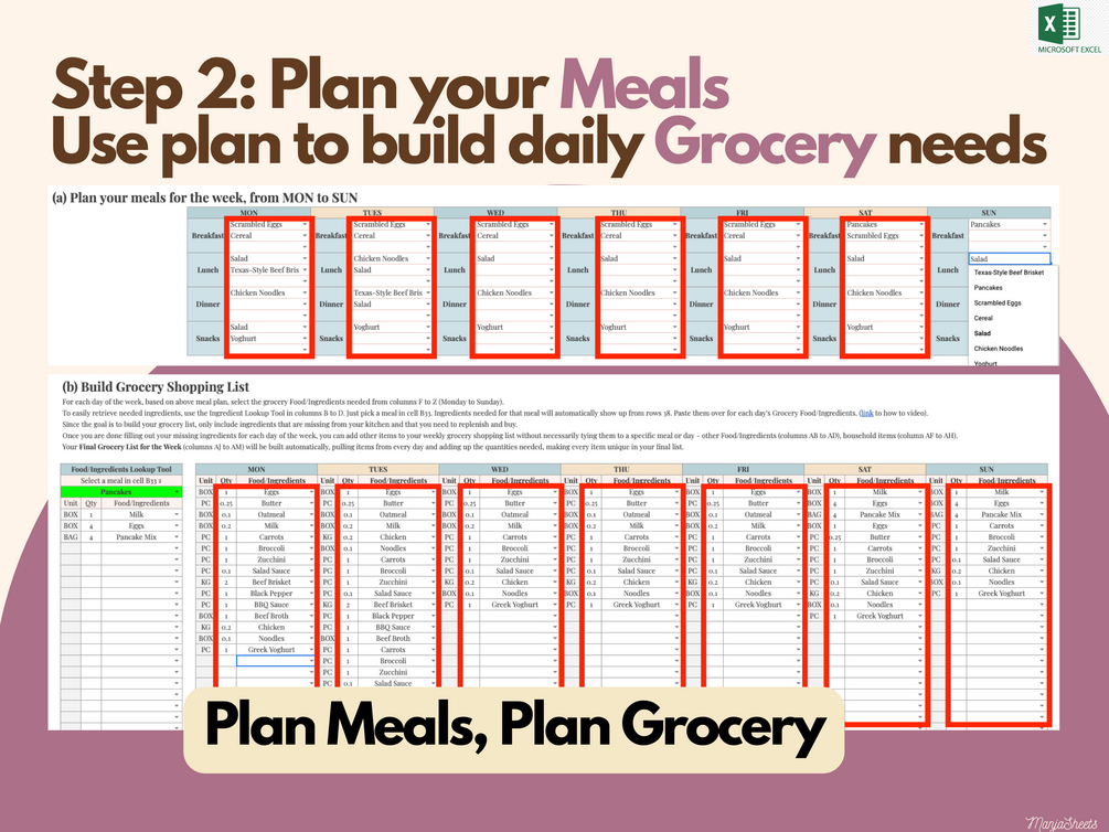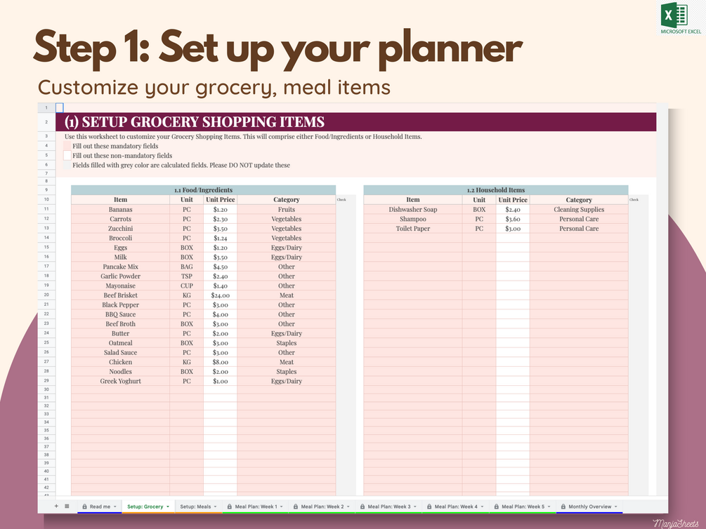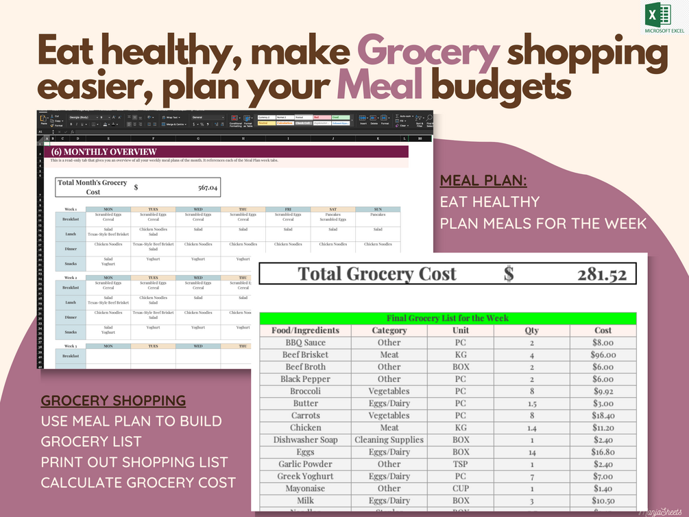 Meal planning? This meal planner and grocery list Excel Sheet helps you eat healthy, make your grocery shopping easier, and plan your grocery budgets.