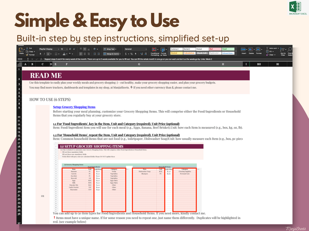 Meal planning? This meal planner and grocery list Excel Sheet helps you eat healthy, make your grocery shopping easier, and plan your grocery budgets.