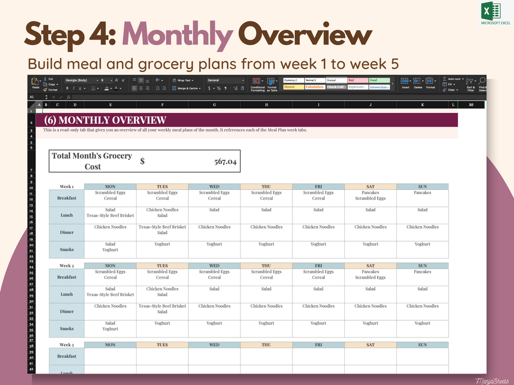 ☆ Monthly Overview: overview of all your weekly meal plans of the month. It also adds up each week's estimated grocery costs to give you the monthly total.