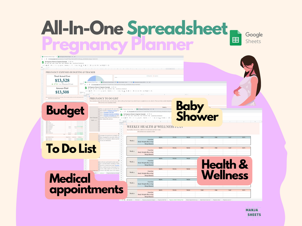 All-in-one Pregnancy Planner Google spreadsheet that helps you prepare, organize and budget for your pregnancy and child birth! Also a great gift for any soon-to-be parents!