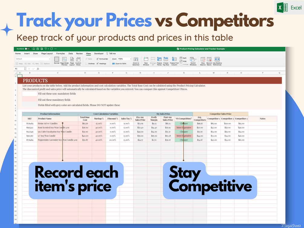 ☆ Track the price of all your products in one worksheet. Keep track of competitors prices while setting your pricing strategy.