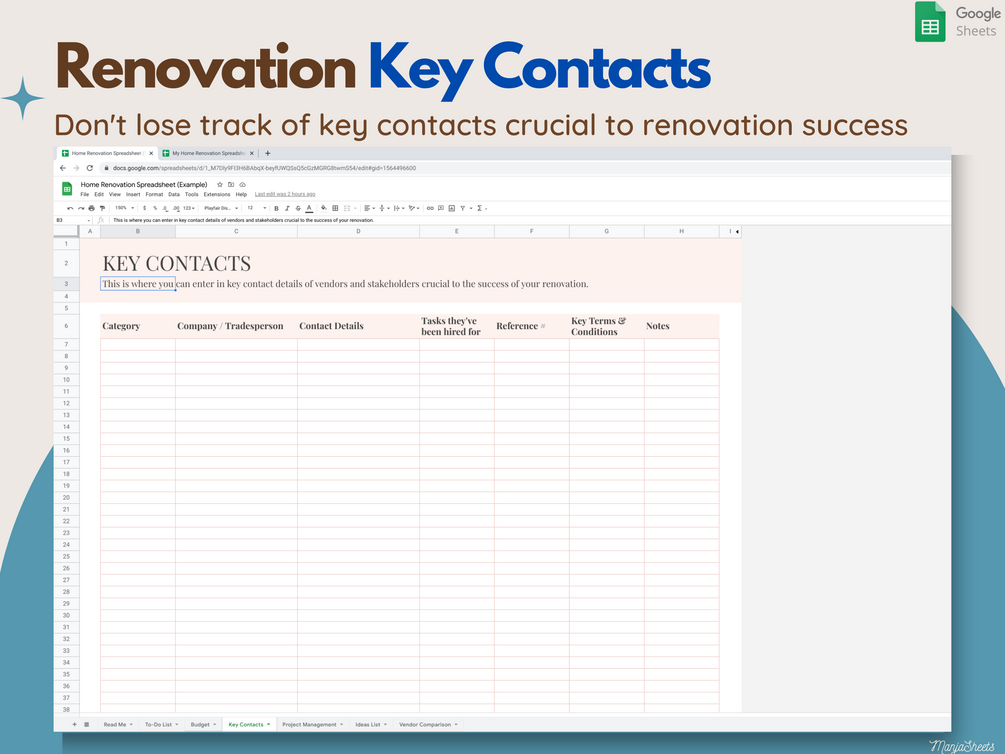 ☆ Key Contacts - This is where you can enter in key contact details of vendors and stakeholders crucial to the success of your renovation. Don't lose these info!