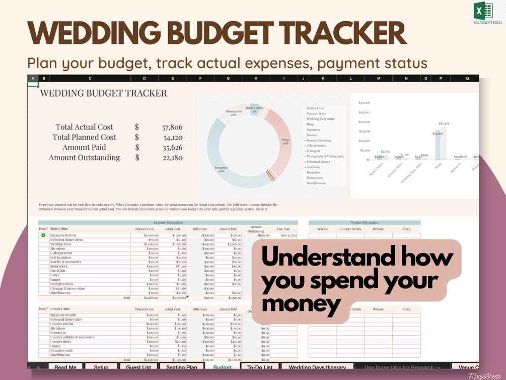 ☆ Plan your wedding budget, track actual expenses and payment status. Includes helpful visuals to know how you spent your money.