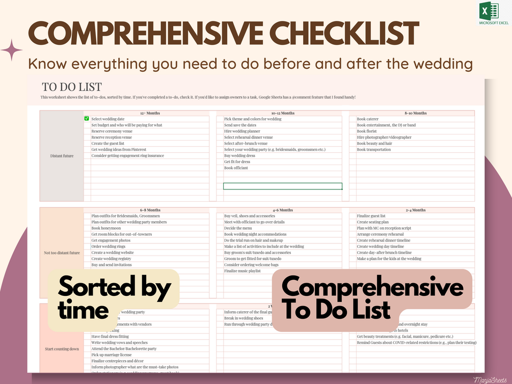 All-in-one wedding checklist spreadsheet that helps you plan, organize and budget for your wedding day. Save time and money with this professionally designed editable template.