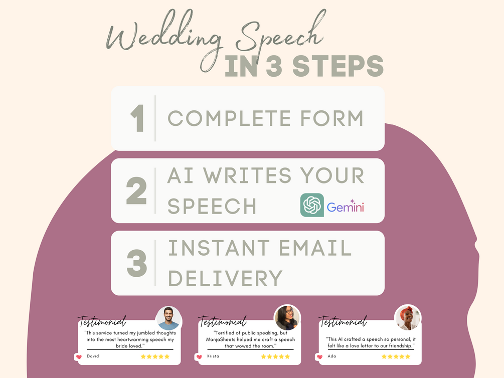 Perfect for the bride, groom, best man, maid of honor, bridesmaids or father of the bride, our personalized digital speech service offers quick, personalized, and impactful speeches to enhance your special day. Save time and deliver a memorable speech with our AI-powered Wedding Speech Writer. Simply fill out a form with your relationship details and desired tone, and instantly receive a tailored speech via email.